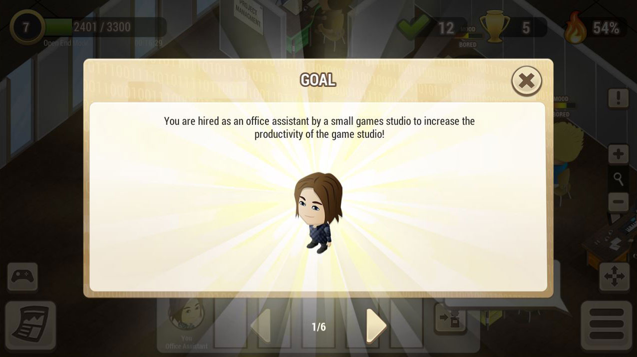 Daher kann er den Wasserspender besuchen, um Gespräche zu beginnen, die zu Gruppenarbeit / Konfliktmanagementverhalten / wertbezogenen Fragen und Multiple-Choice-Antworten führen, aus denen er wählen kann. Außerdem muss er den Arbeitsablauf steuern, indem er mit den Mitarbeitern interagiert und ihr Arbeitspaket so gut wie möglich organisiert, um gute Bewertungen und Auszeichnungen für die ausgelieferten Spiele zu erzielen.